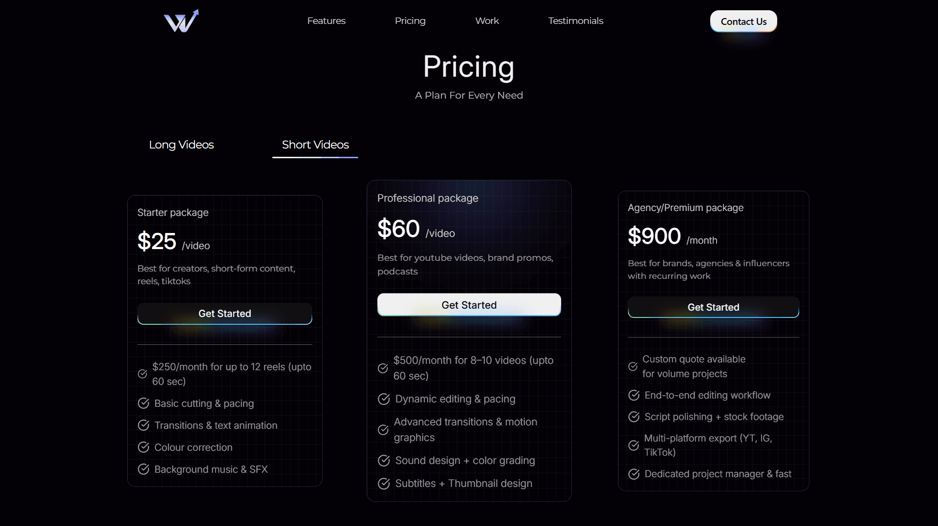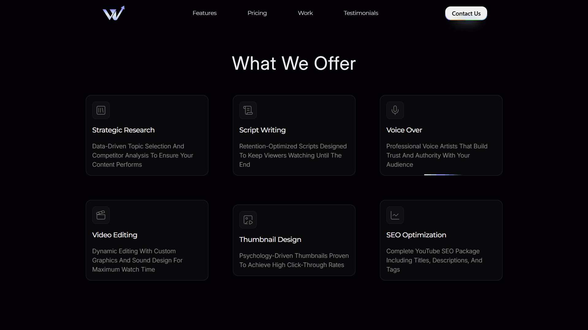 Developed a modern, sleek, dark theme website for VidWerk, a high-retention video production agency.
